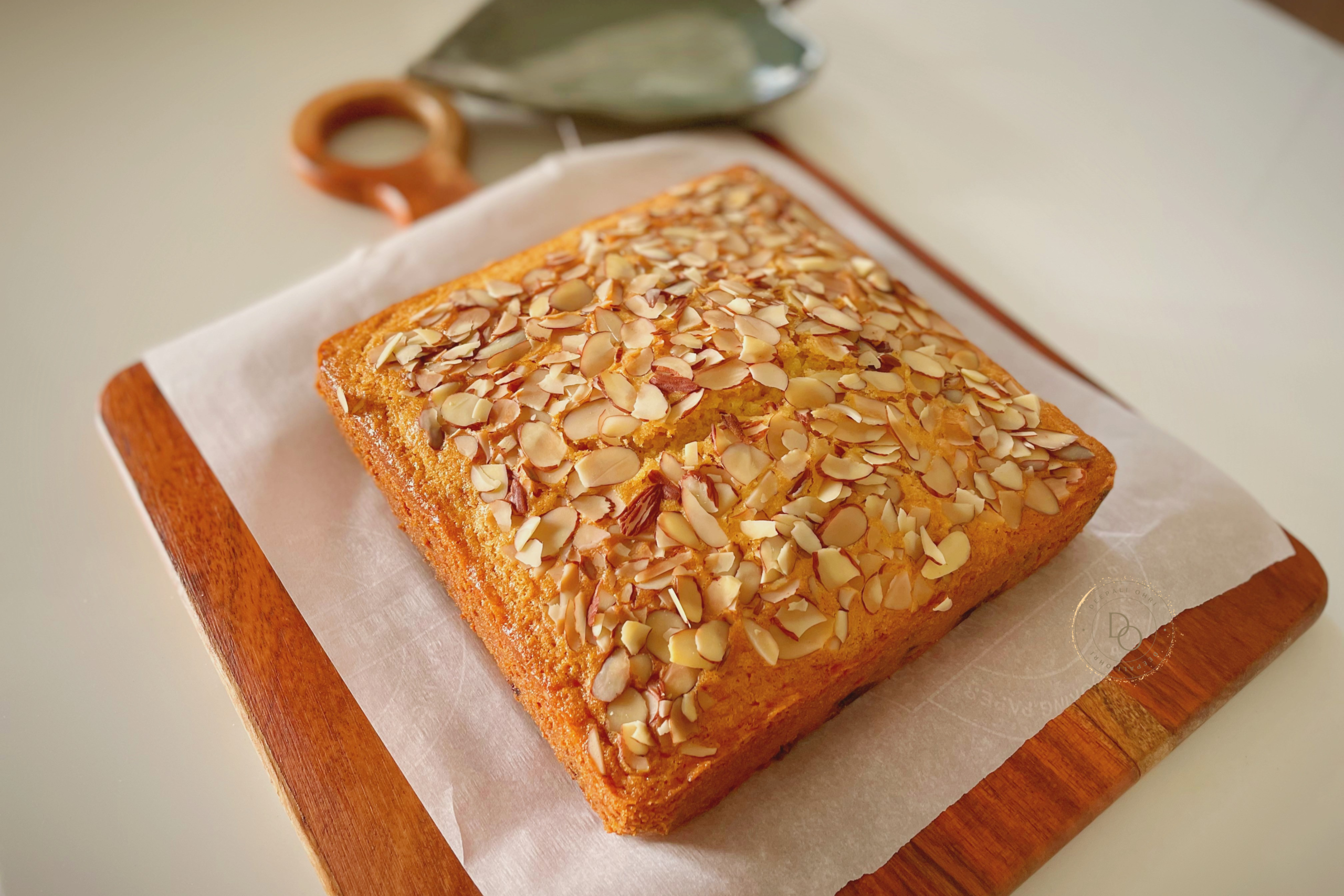 Slivered almonds create a lovely light crunch on top of the soft cake.